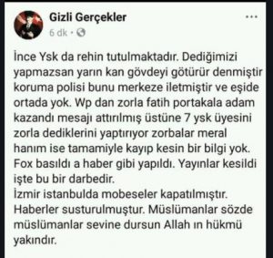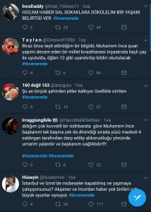 Seçim sonuçlarının açıklandığı ve artık kritik eşiğe gelindiği anlarda CHP’de yenilgi havası iyiden iyiye başlamıştı. Çaresizlik bir kez daha kapılarına dayanmış ve ne yapacaklarını şaşırmış halde sağa sola saldırıya geçmişlerdi. Muharrem İnce’de ses seda yoktu ve kendisinden bir açıklama henüz yapılmamıştı. Özellikle Twitter’da yalanlar ve komplo teorileri esmeye başladı. Sonradan anlıyoruz ki asıl yalan rüzgarı bu kesimin whatsapp gruplarında esmiş. O gece neler yazılmamıştı ki! En fazla yazılan şey Muharrem İnce’nin kaçırıldığıydı. Güya Erdoğan aslında seçimi kaybetmiş, İnce ile Meral Akşener’i bilinmeyen bir yere kaçırmışlardı. Şunları da ardı ardına söylüyorlardı. Oylar çalınıyor, CHP’nin oyları çöp bidonlarında yakılıyor, Muharrem İnce’ye geri adım attırmak için eşini kaçırmışlar, tehdit ediyorlar, rakip siyasi liderleri iç savaşla tehdit ettiler, İnce’nin telefonu ele geçirildi, İnce’yi dövdüler, yüzü yara bere içinde olduğu için ekrana çıkamıyor, İnce’nin annesini de dövmüşler, İstanbul ve İzmir’de mobeseler kapatılmış, Fox tv binası basılmış…vs, liste böyle uzayıp gidiyor.
